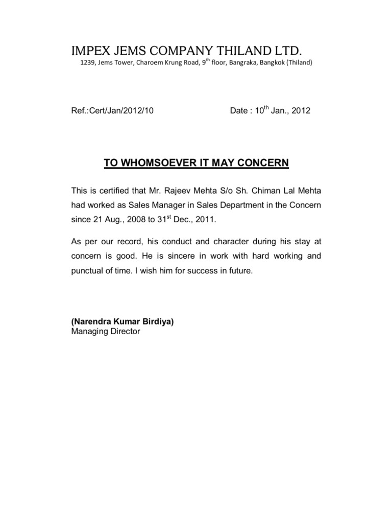 This letter certifies the time spent by the employee in that organization and his conduct during the job.